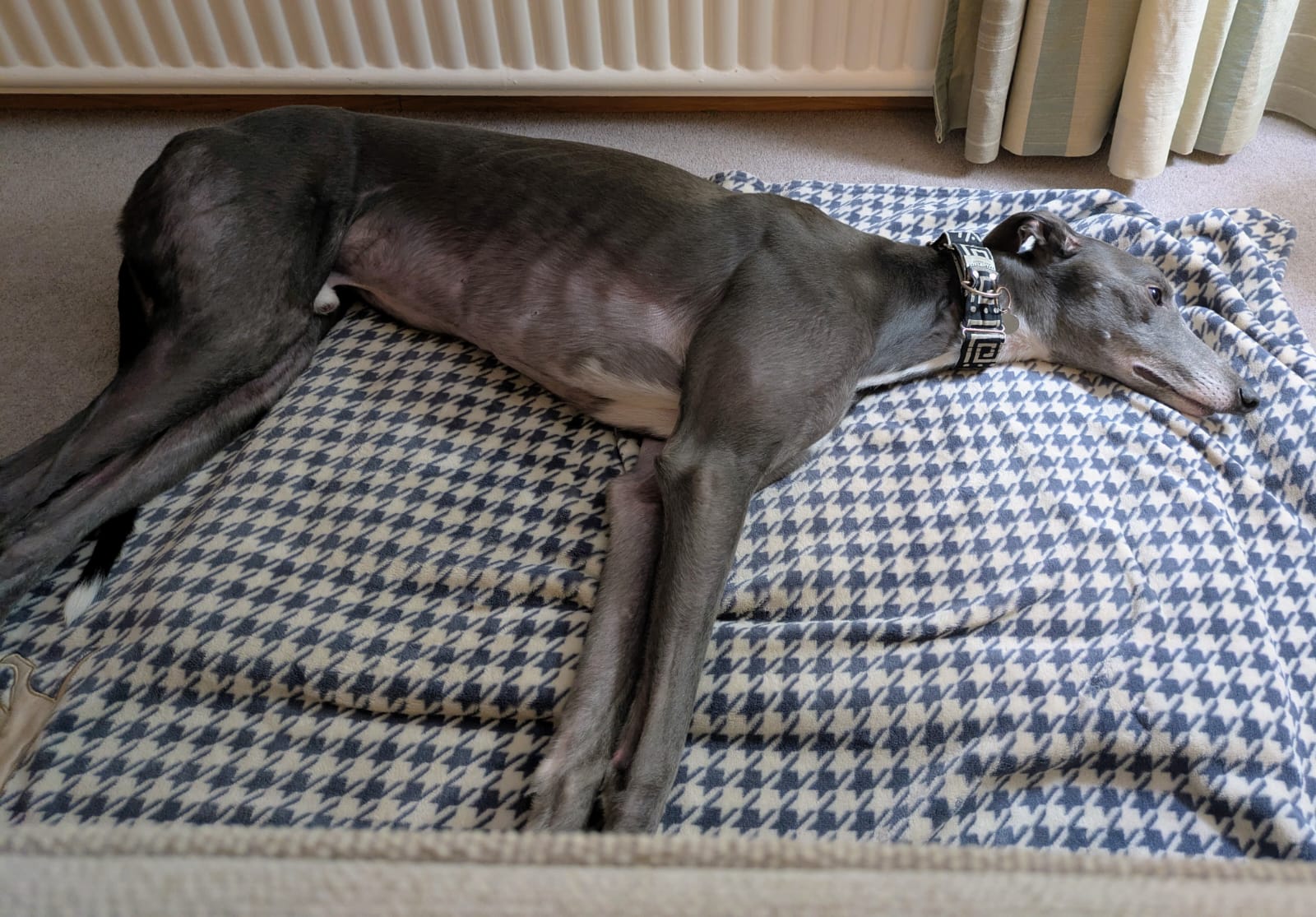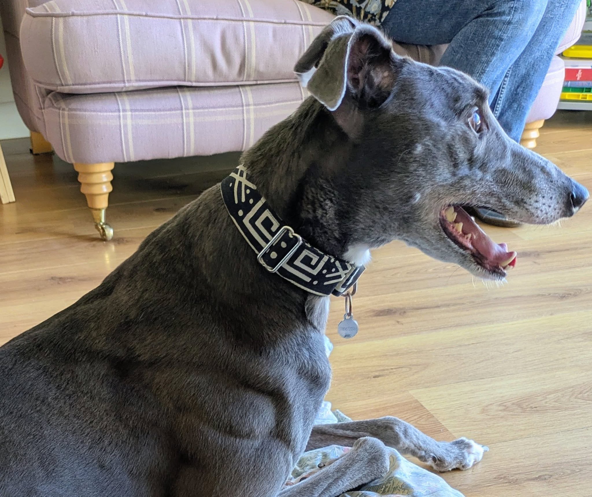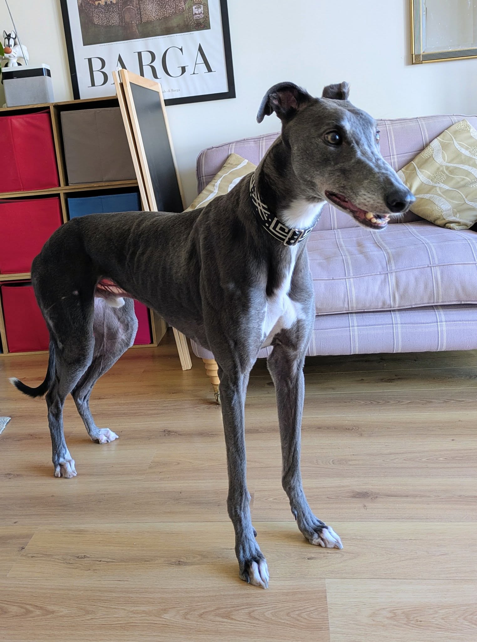 He enjoys playing with his greyhound friends, loves his walks, and is an absolute gentleman on the lead. He is very gentle with dogs he meets out and also travels so well in the car, making him the perfect adventure buddy or relaxed companion.